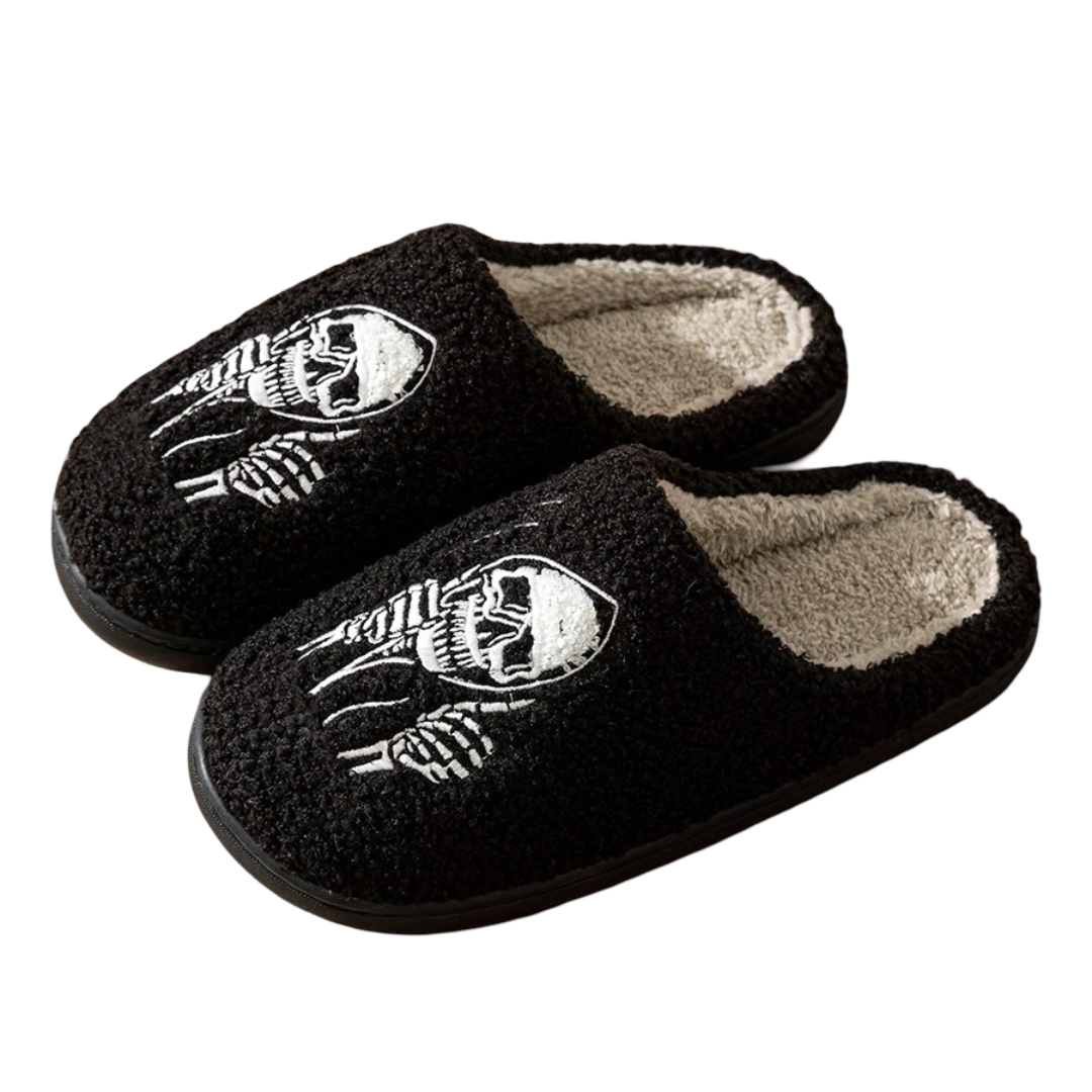Halloween Skull Face Plush Slippers: Step into spooky comfort with these Halloween Skull Face Plush Slippers. Made from soft plush material, they provide cozy warmth while showcasing a fun skull design perfect for the season. Available in sizes 37-38, 39-40, 41-42, and 43-44, they fit most adults comfortably. The plush material cushions your feet, while the non-slip sole ensures safety on smooth surfaces. Ideal for Halloween parties or lounging at home, these slippers combine spooky style with ultimate comfort and practicality.